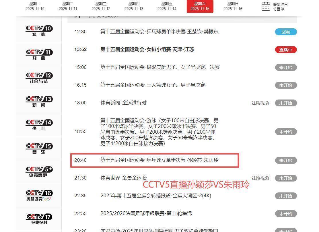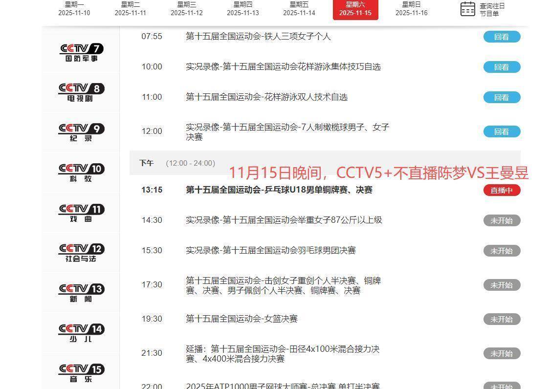 女单半决赛陈梦与王曼昱的对决,被安排在晚间20点30分进行。然而,根据央视节目单显示,CCTV5频道在该时段直播的是孙颖莎对阵朱雨玲的比赛,而CCTV5 频道则同步转播了女篮决赛。一位乒乓球专项记者在社交媒体上透露,此次转播安排早在三天前就已经确定。由于全运会期间多项决赛赛事时间重叠,制作团队不得不优先保障集体项目的直播信号。尽管如此,部分球迷通过地方体育频道和网络平台观看了陈梦与王曼昱的比赛录像。比赛录像在短视频平台发布12小时后,播放量就突破了5000万次,可见这场比赛的关注度之高。