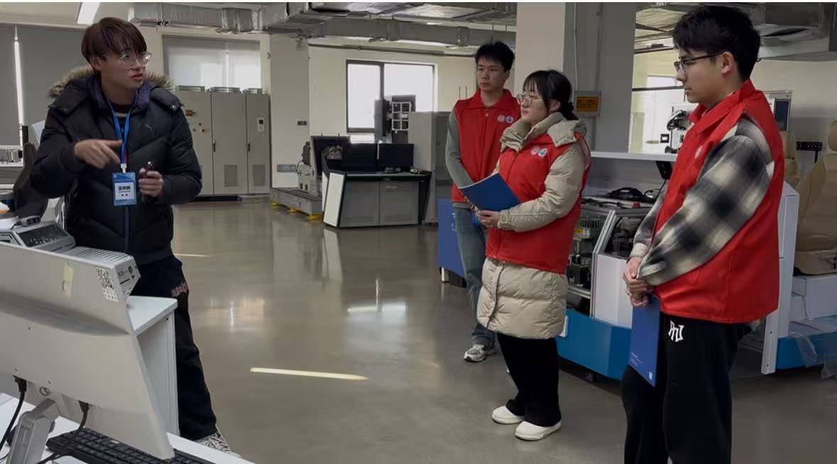 实践活动期间,济南派蒙机电技术有限公司市场部经理李丙洋带领实践学子们深入企业研发核心区域及产品展厅,围绕智能网联汽车领域展开系统全面的专业分享与实地观摩。作为国内领先的新能源汽车教学设备研发企业,山东派蒙机电技术有限公司展厅内陈列着一系列专业前沿的实验设备,涵盖智能网联整车研发测试实验台、智能底盘与动力系统实验台、环境感知实验台、新能源汽车电机控制系统开发与测试实验台等,全方位为学子们呈现了从动力系统到智能驾驶的完整技术链条,让抽象的技术原理变得直观可感。本次分享紧扣行业前沿、聚焦核心要点,开篇便从智能网联汽车的交叉学科融合特点切入,清晰阐释其多领域融合的核心特质;随后,重点讲解了大模型在车载语音识别、环境感知等关键场景的落地应用,结合展厅实验设备深入拆解了无人驾驶“定位-感知-规划-控制”的全流程核心技术逻辑;最后,详细介绍了国内智能网联汽车相关项目的推进现状,全方位、多角度呈现了该领域的发展态势与技术体系。分享过程中,实践学子们全程专注聆听、认真记录,主动围绕激光雷达应用、实验台操作原理等技术细节与李经理深入探讨、积极交流,现场互动氛围热烈浓厚。此次展厅观摩结合研发场景探访与专业深度解读,让学子们对智能网联汽车的跨学科属性形成了直观且深刻的认知,进一步明晰了车辆工程与人工智能、计算机技术的融合路径,为后续专业学习、实践探索明确了方向、提供了有力参考。